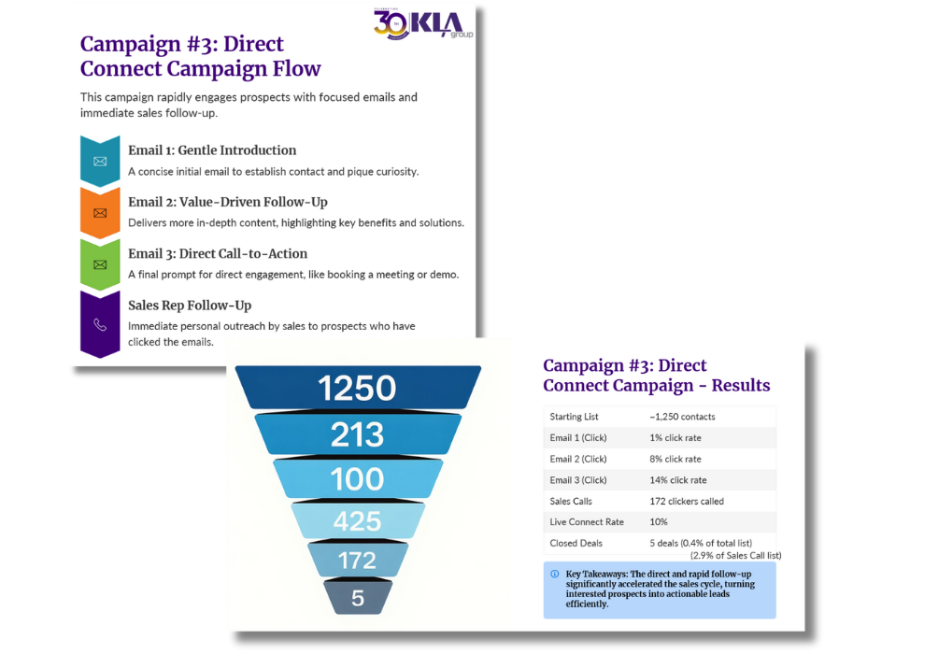 The Direct Connect Campaign is another that KLA Group designed and ran for clients with what we call “warmer cold lists”—names they had gathered from events, referrals, or previous interactions but had not yet converted. It’s built for speed and direct results, making it one of the most effective outbound sales campaigns we deliver.