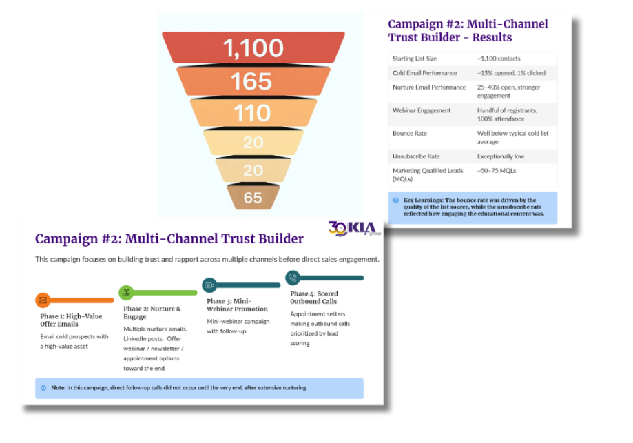 The Multi-Channel Trust Builder builds the most trust. KLA Group’s campaigns use email, LinkedIn, and webinars to build credibility before asking for a meeting. It’s a highly effective B2B lead generation approach.